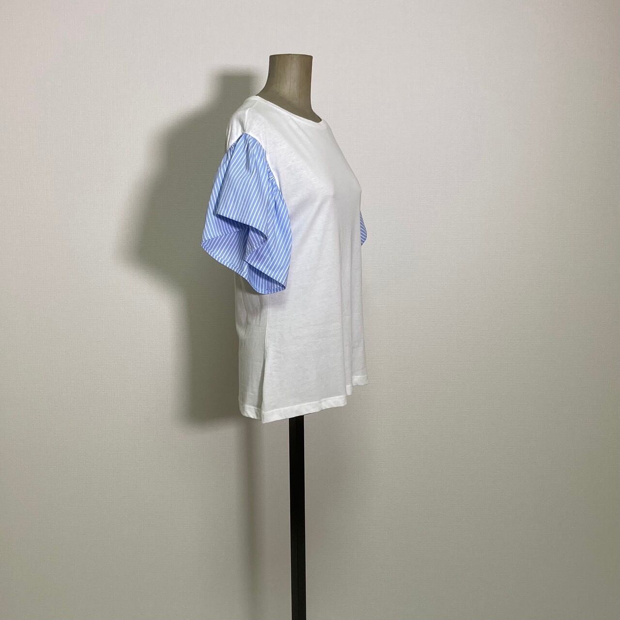 FLYGIRL ホワイト袖ブルーストライプ柄布帛 Tシャツ